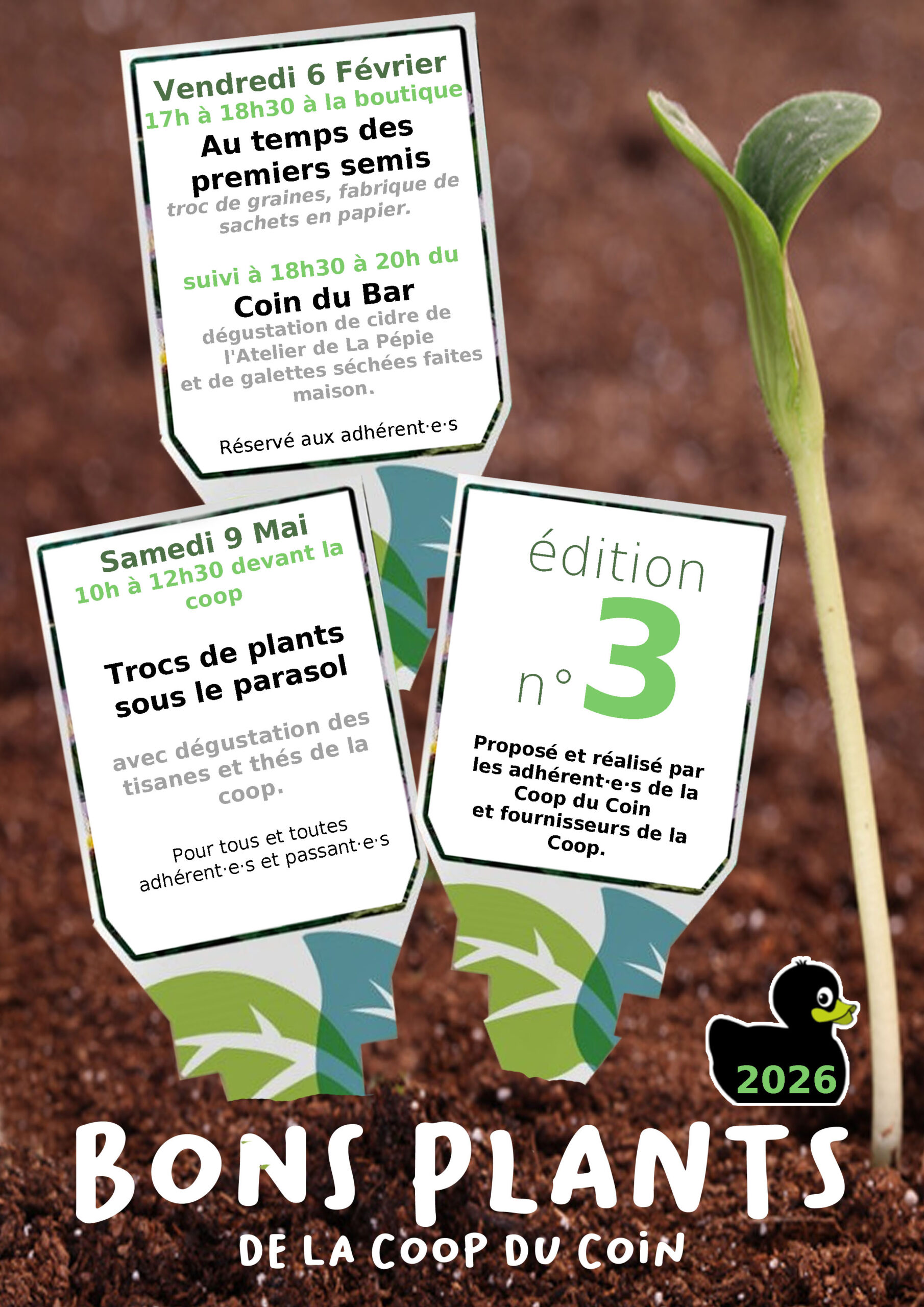 Publié le 1 février 20261 février 2026 par Com de la CoopTroc de graines et Coin du Bar le vendredi 6 février Deux moments conviviaux d’échanges autour du jardinage et de dégustations de produits de la Coop. A ne pas manquer!