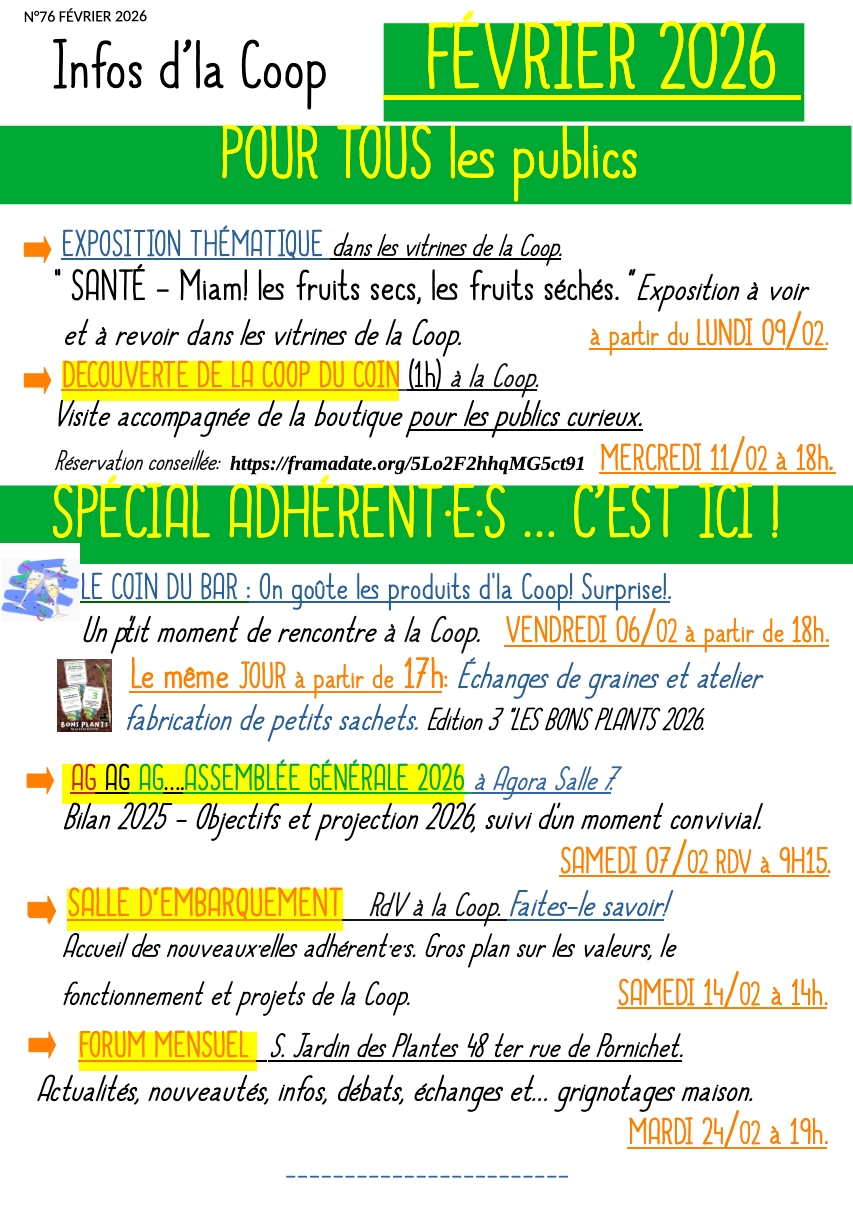 La prochaine salle d’embarquement aura lieu le Samedi 14 février à 14h à la boutique. Pour mémoire, c’est un rendez-vous qui a lieu tous les mois. Elle a vocation à accueillir les nouveaux et nouvelles adhérent·es mais pas uniquement! C’est le moment idéal pour apprendre tout ce que tu as toujours voulu savoir sur la Coop : fonctionnement de la boutique, fonctionnement et valeurs de l’association, historique… Tout ça en petit comité et dans une bonne ambiance !