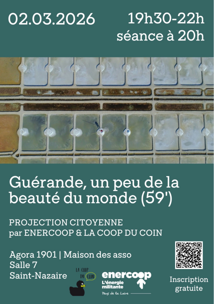 La Coop du Coin et la coopérative d’énergie renouvelable Enercoop Pays de la Loire s’associent pour vous proposer une projection du documentaire « Guérande, un peu de la beauté du monde ». L’occasion d’échanger sur nos pratiques et sur les forces et valeur du modèle coopératif.