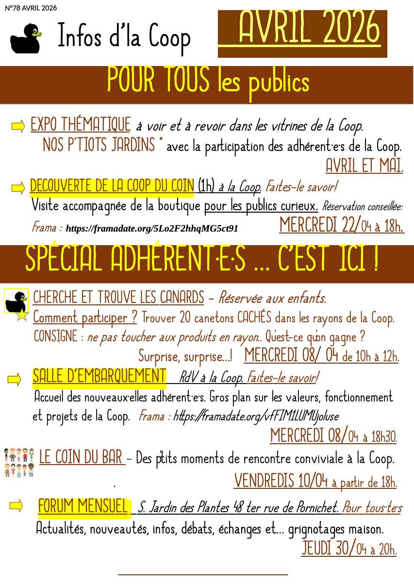Satisfait.e de l’ouverture du mercredi matin ? Des questions, des difficultés ? N’hésite pas à faire part de tes remarques sur la boîte contact@lacoopducoin.fr, on transmettra le tout au forum d’avril, pour le bilan !